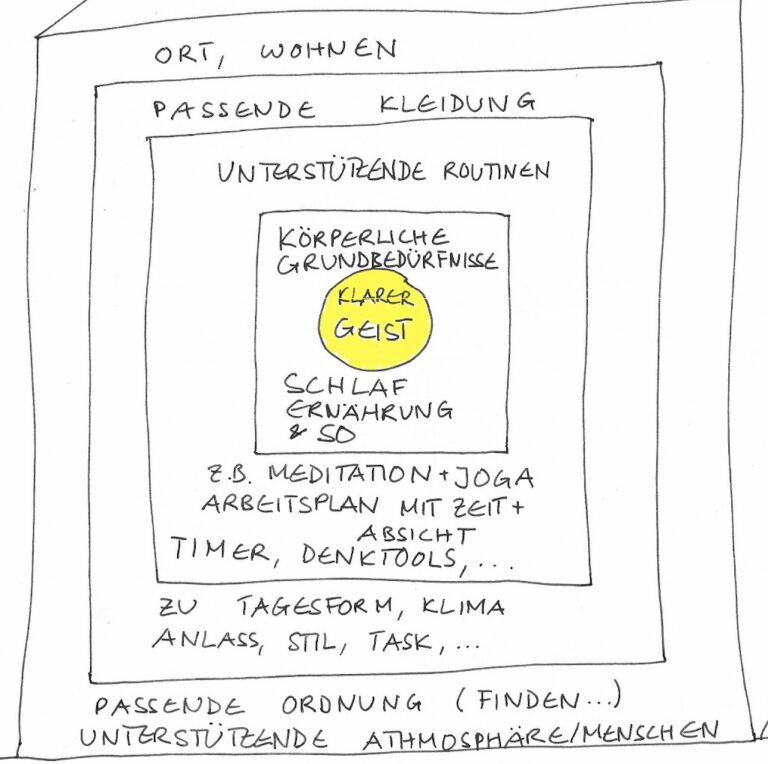 Ein klarer Geist trägt wesentlich zu meinem Wohlbefinden und meiner Beziehungs- und Arbeitsqualität bei. Mal konzentriere ich mich auf die Ernährung oder Routinen, mal erkläre ich mangelnde Klarheit mit dem Alter, ADHS, schlechtem Schlaf, oder …. („fill in the blank…“)……