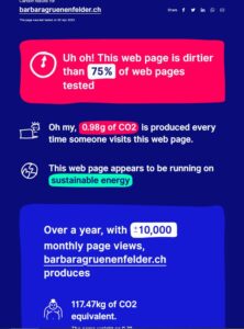Es war nicht einfach, die Umweltverträglichkeitshinweise auf den Websiten zu finden oder einzuschätzen. manchmal fand ich Hinweise bei „über uns“ oder bei den Werten der Firma, manchmal auch nicht (aber fand die Seite dann doch – auf der Seite der Digitalagentur „Webkinder“: https://www.webkinder.ch/insights/nachhaltiges-webdesign-mit-wordpress-digital-ist-nicht-gleich-gruen/